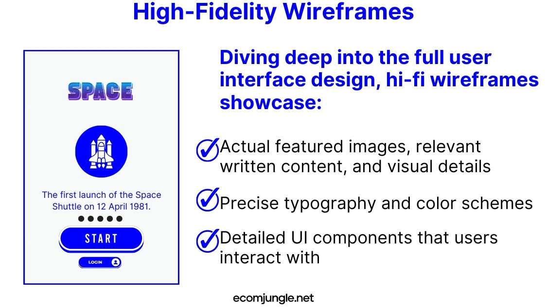 - High-fidelity wireframes are as close to the final product as possible, providing valuable insights for usability testing and final adjustments before the development stage.