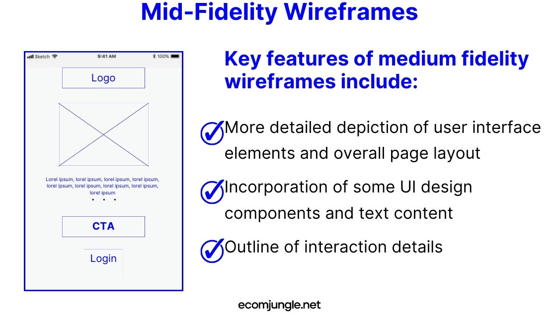- Mid-fidelity wireframes bring in more clarity and specificity, making them ideal for refining the user interface elements and starting to consider user interactions.