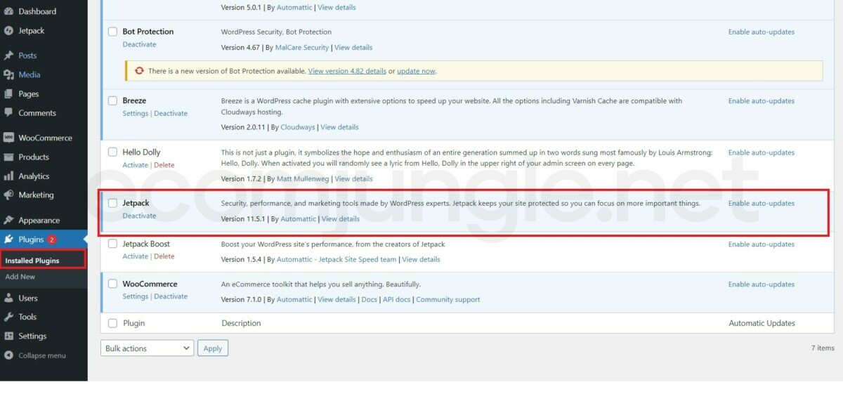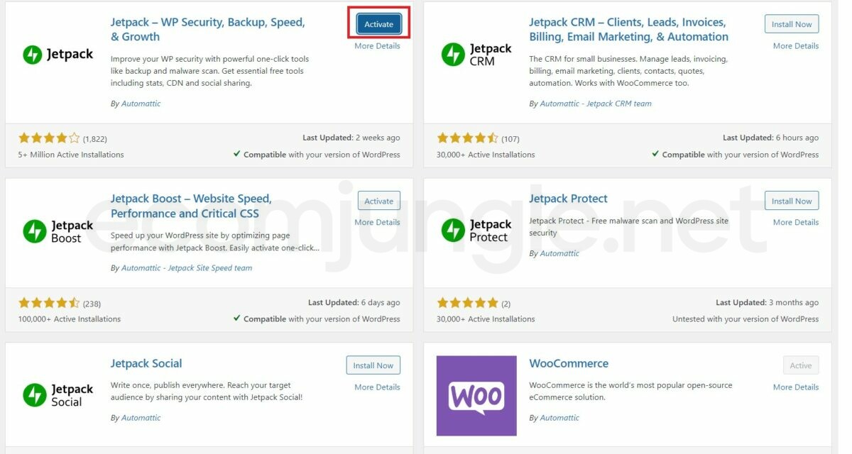 - Once you’ve installed (and/or activated) a plugin, you will find it in the Installed Plugins section. In our example, we installed and activated Jetpack. Scrolling down on the Installed Plugins page, we find it near the bottom.