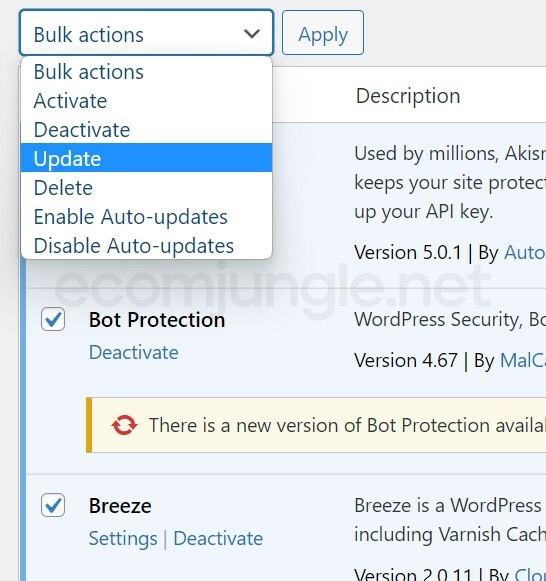 If you are ready to update multiple plugins simultaneously, you can select the checkbox for multiple plugins and then click the Bulk actions dropdown menu and select Update. Then click Apply.