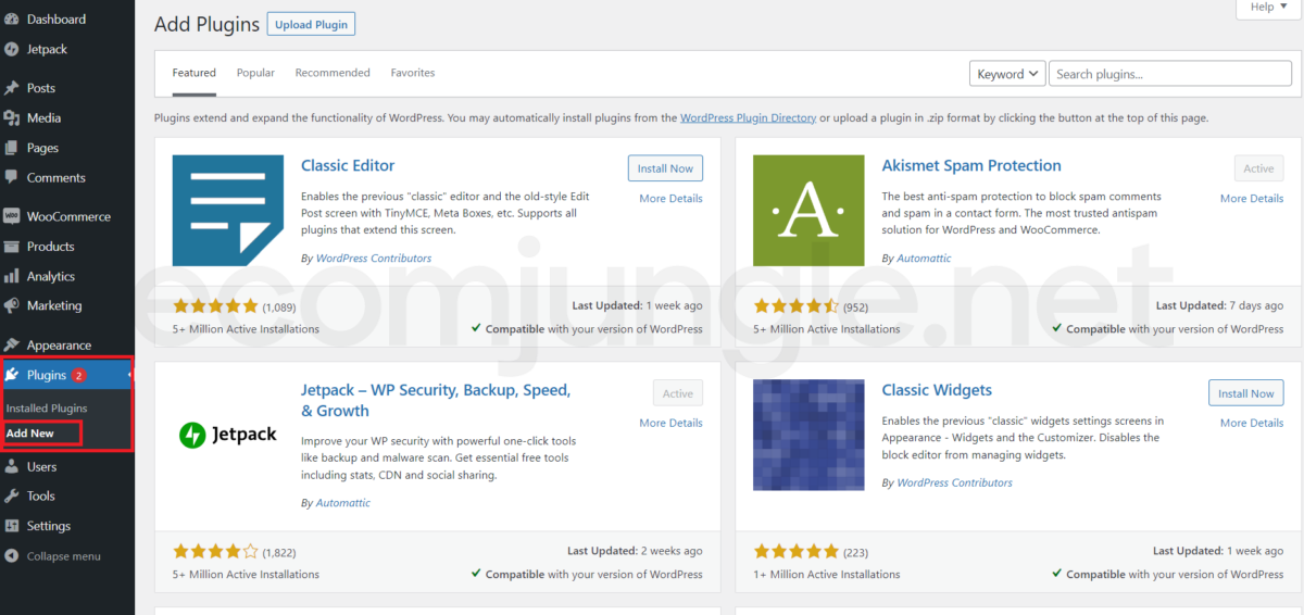 Some of the most popular WordPress plugins are HubSpot, WooCommerce, Yoast SEO, Jetpack, Elementor, and WPForms. These plugins have risen to prominence because they have great features and functionality that users love. To install a plugin from this list, head to your admin sidebar and select Add New.