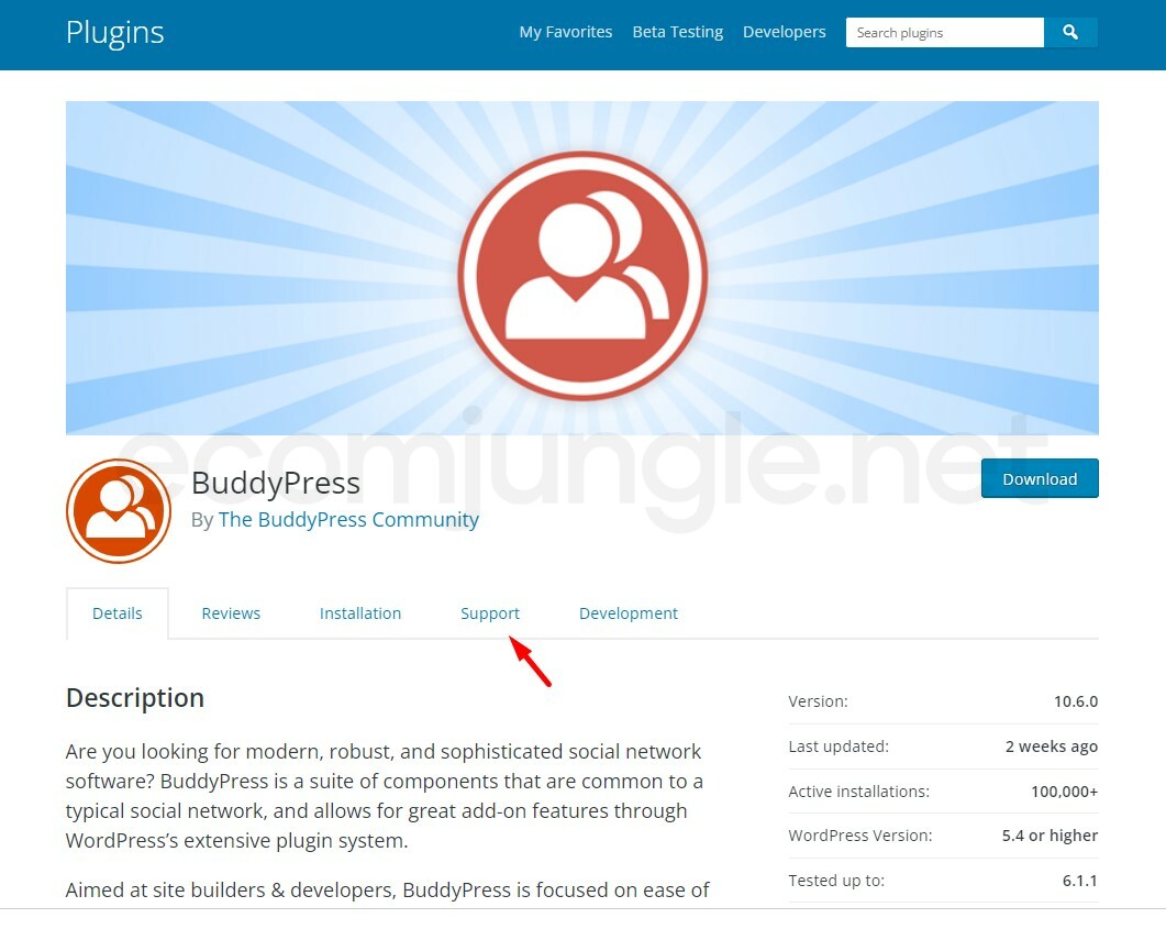 When the extended plugin page on the WordPress website opens, click the Support tab.
