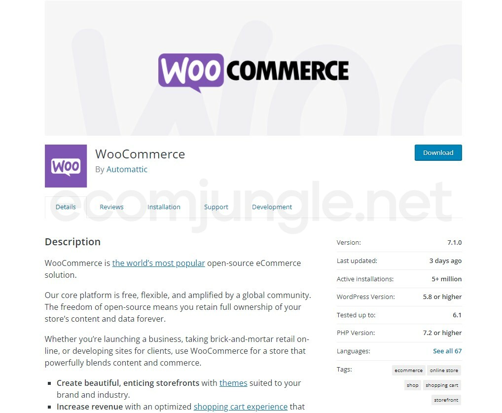 WooCommerce is the number one e-commerce plugin (and the one we’ll be using later in this tutorial series). WooCommerce is incredibly powerful as an e-commerce platform for creating compelling storefronts and customized product pages, managing payments and shipping, and growing your business with improved SEO. You can add additional plugins from the WooCommerce marketplace to further customize your site for all your e-commerce needs.