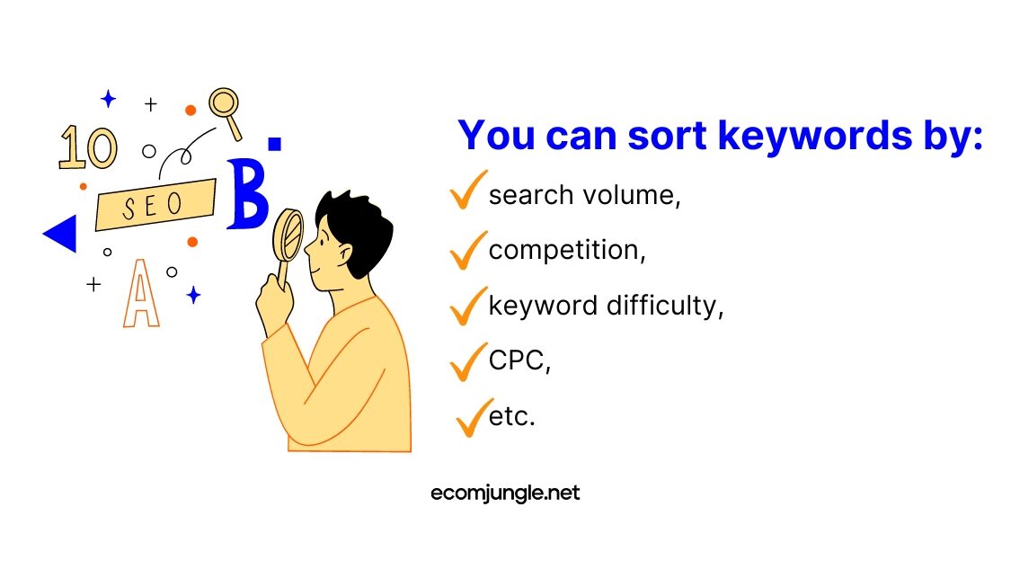 Sort them according to search volume, competition, keyword difficulty, CPC, etc.