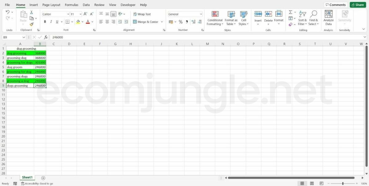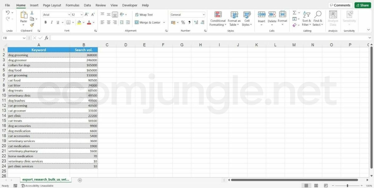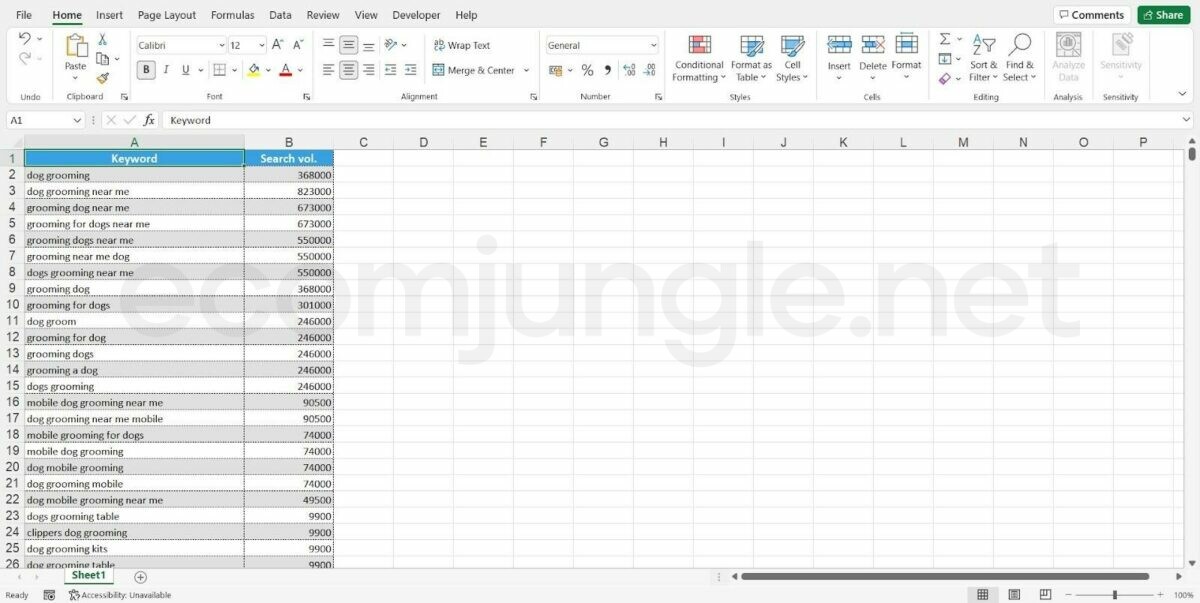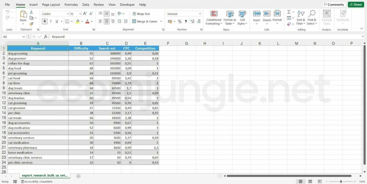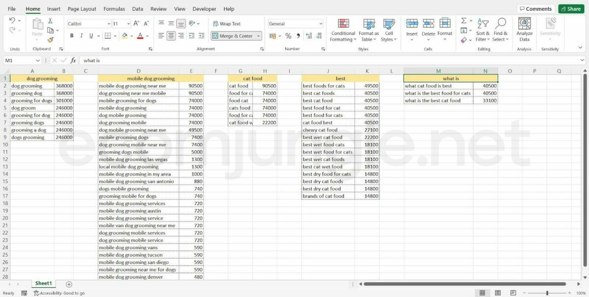 - Repeat these steps for all your desired keywords in this sheet and then move on to the following suggested keyword sheet. In the end, it should look something like this: