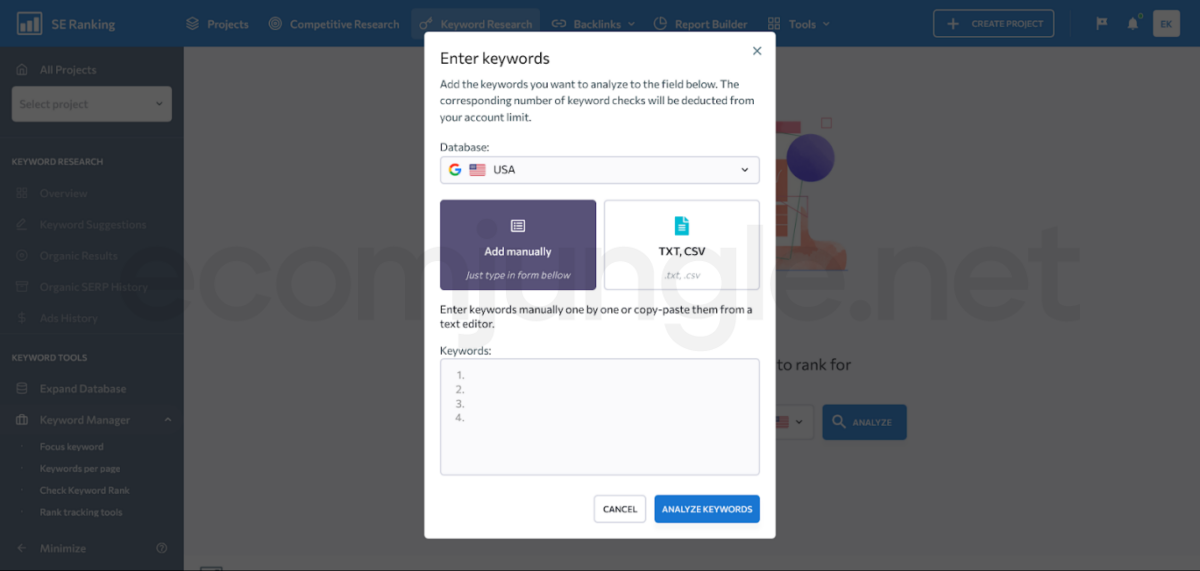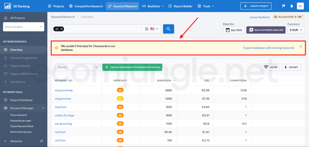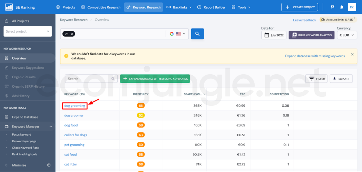 - Go back into SE Ranking, and now you should click on each of the keywords one by one to open up the keyword suggestions option.