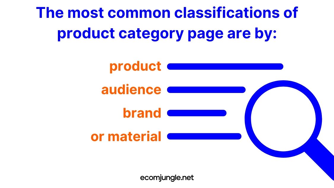 Categories are pages within your website that organize the content under a criterion. For an eCommerce content plan, the most common classifications are by product, audience, brand, or material.