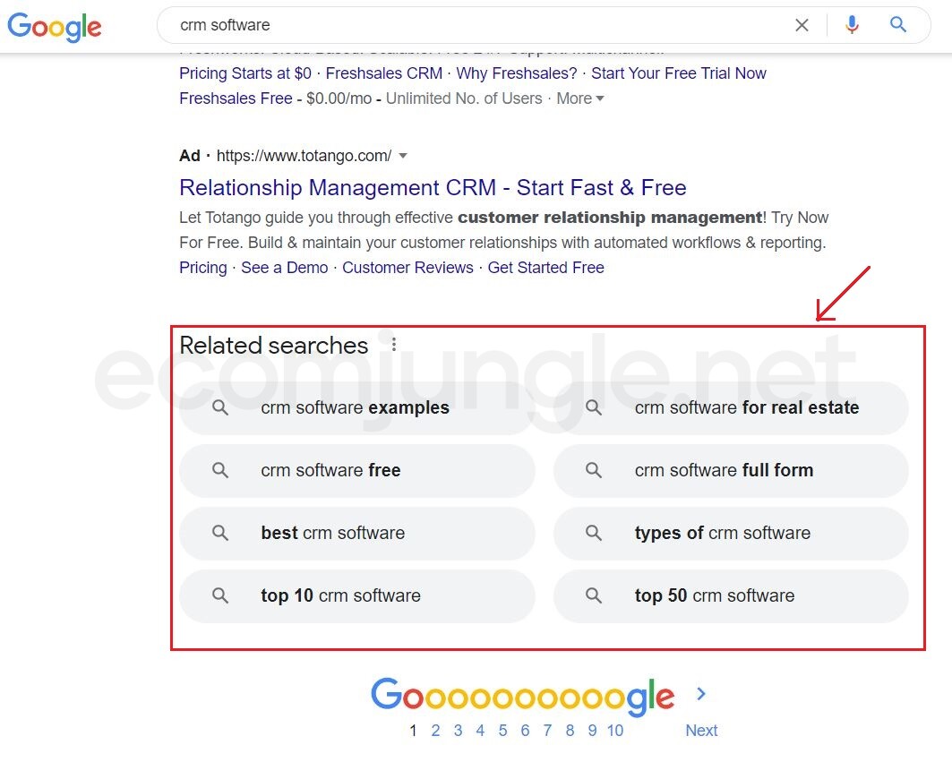When you type a word in the search engine, related searches are those terms that Google suggests. So, for example, if you query CRM software, Google offers you that you might also be interested in “CRM meaning”, “CRM pricing”, “CRM free trial” etc.