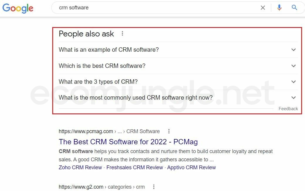 How to find seed keywords here? People Also Ask is a question box embedded in the organic results. These questions are related to a user’s search term; you can discover short and long-tail keywords.